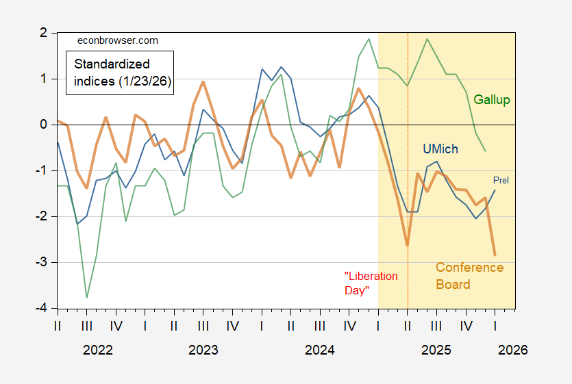 Figure 1: U.Michigan Economic Sentiment (blue), Conference Board Confidence Index (brown), Gallup Confidence (green), all demeaned and divided by standard deviation 2021M01-2025m02. Red dashed line at “Liberation Day” Source: UMichigan, Gallup, Conference Boardand author’s calculations.