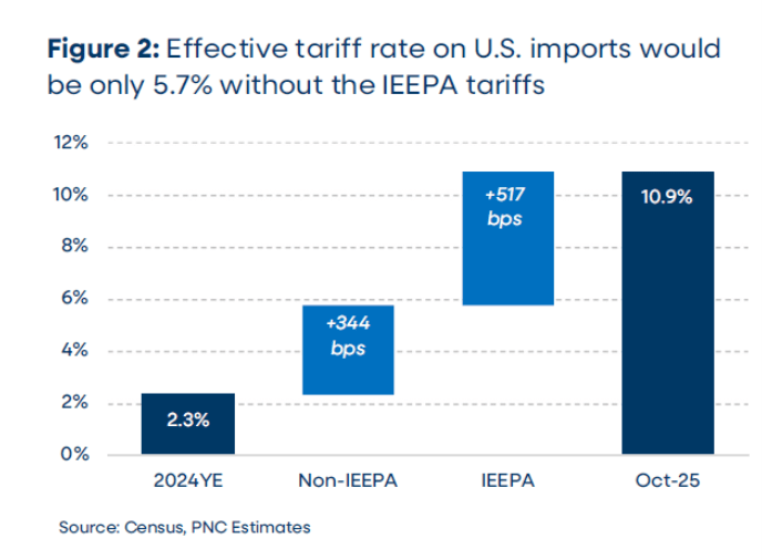 According to PNC Financial Services Economic Researcheliminating the IEEPA tariffs would at least in the short term reduce the realized effective tariff rate: