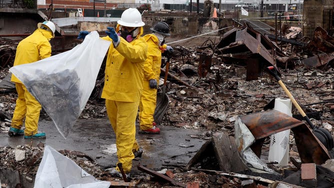 • PACIFIC PALISADES,  CA  – OCTOBER 14, 2025 —  Workers clear debris from a business destroyed in the Palisades fire as scattered downpours, powerful winds and fears of flooding continue to threaten areas of the Pacific Palisades on October 14, 2025. The recent rain prompted evacuation warnings for residents near recent burn areas in the Pacific Palisades. (Genaro Molina/Los Angeles Times via Getty Images)