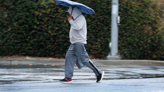• Monrovia, CA – October 14:  A pedestrian runs across the street with an umbrella amid the rain in Monrovia Tuesday, October. 14, 2025. A brief but substantial storm brings heavy rain, thunderstorms and flooding to Southern California today, prompting evacuation warnings for residents near recent burn areas. The storm is expected to produce between three-quarters of an inch to an inch-and-a-half of precipitation across most areas, with 2 to 4 inches possible on south-facing mountain slopes. (Allen J. Schaben / Los Angeles Times via Getty Images)