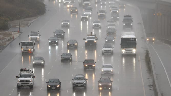 • San Diego, CA – October 14: Traffic backs up on southbound Interstate 805 in Sorrento Valley during a steady rain on San Diego, CA.  (K.C. Alfred / The San Diego Union-Tribune via Getty Images)