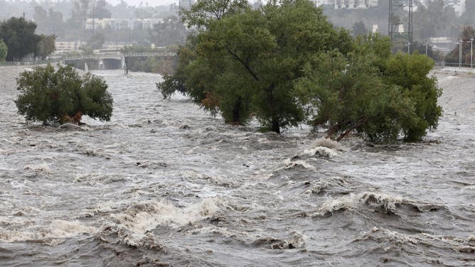 • LOS ANGELES, CALIFORNIA – OCTOBER 14: Water flows past trees in the Los Angeles River, swollen by storm runoff, on October 14, 2025 in Los Angeles, California. A strong atmospheric river storm is hitting Southern California today, triggering evacuation warnings in the Eaton and Palisades fire burn scars due to debris flow fears. (Photo by Mario Tama/Getty Images)