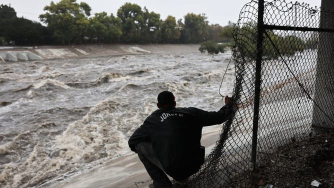 • LOS ANGELES, CALIFORNIA – OCTOBER 14: A man who said he has been experiencing episodic homelessness watches water flow in the Los Angeles River, swollen by storm runoff, on October 14, 2025 in Los Angeles, California. A strong atmospheric river storm is hitting Southern California today, triggering evacuation warnings in the Eaton and Palisades fire burn scars due to debris flow fears. (Photo by Mario Tama/Getty Images)