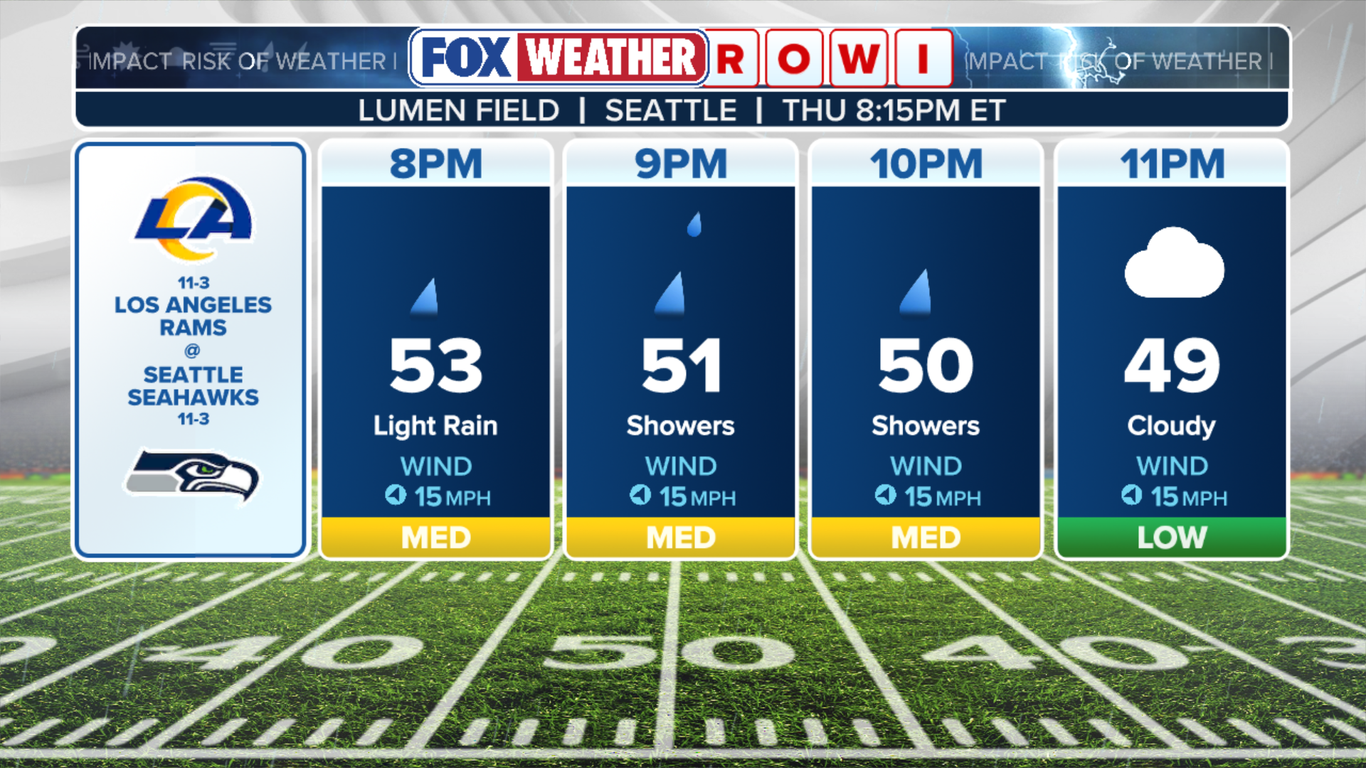 For fans attending the game, there is a low risk of weather impacting the game (ROWI), with temperatures starting at 52 degrees by kickoff and a 39% chance of precipitation, according to the FOX Forecast Center. This is ideal football weather for players and tailgaters alike.