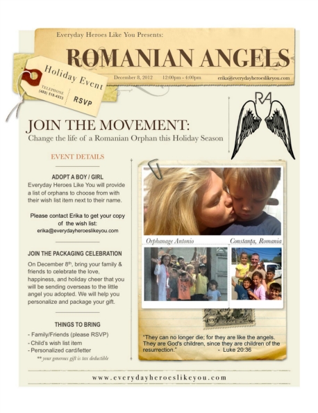 The flier says people can “change the life of a Romanian orphan this holiday season” by “adopting” a child, which involved selecting their name from a list, purchasing their “wish list item,” and then bringing it to pack as a gift that would be sent to Orphanage Antonio in Constanta, Romania. An archived version of Everyday Heroes Like You’s website says the project involved a partnership with U.S. service members and United Hands Romania.