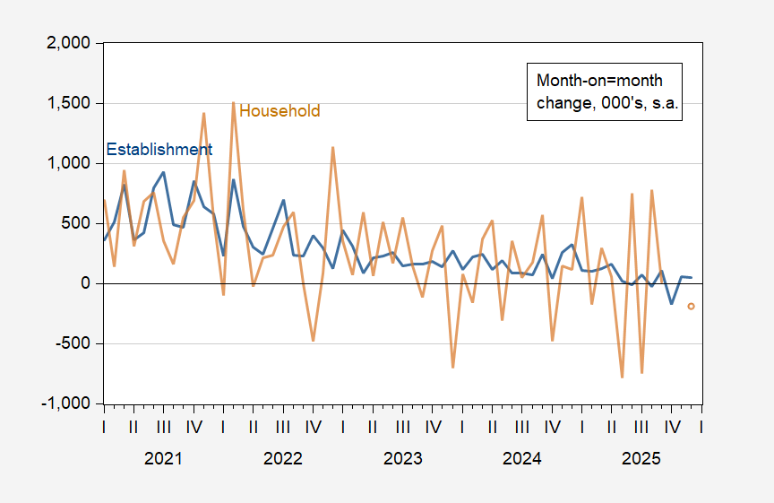 As I noted back in August 2024, this is a sort of “Great Replacement” screed (I won’t validate it by calling it a theory) which has no place in proper economic discourse. But even more importantly, Antoni is ignoring the issues with the CPS employment series — in particular the population controls used — which invalidate his assertion regarding foreign born/native born employment trends during 2022-24 (see Edelberg and Watson, 2024).