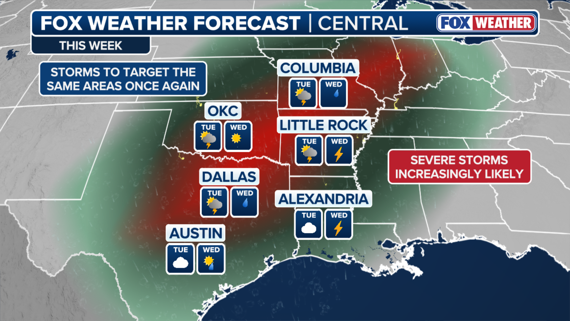 More rounds of severe weather are targeting the Heartland by midweek, bringing renewed threats of strong winds, damaging hail, and possible tornadoes Tuesday through Wednesday. This will come just days after communities still reel from a deadly tornado outbreak. FOX Weather Meteorologist Michael Estime breaks down what’s happening: